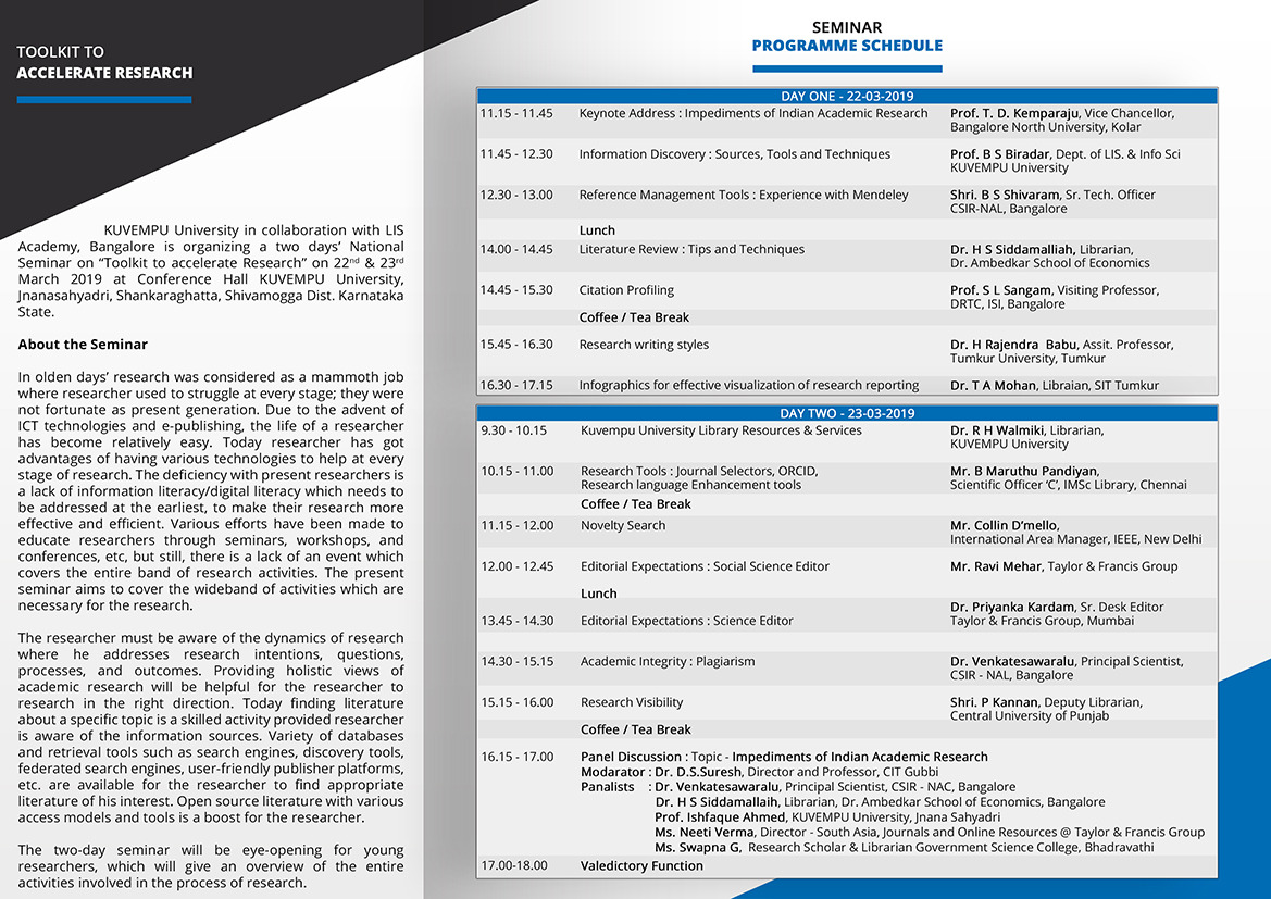 In olden days research was considered as a mammoth job where researcher used to struggle at every stage; they were not fortunate as present generation. Due to the advent of ICT technologies and e-publishing, the life of a researcher has become relatively easy. Today researcher has got advantages of having various technologies to help at every stage of research. The deficiency with present researchers is a lack of information literacy/digital literacy which needs to be addressed at the earliest, to make their research more effective and efficient. Various efforts have been made to educate researchers through seminars, workshops, and conferences, etc, but still, there is a lack of an event which covers the entire band of research activities. The present seminar aims to cover the wideband of activities which are necessary for the research.