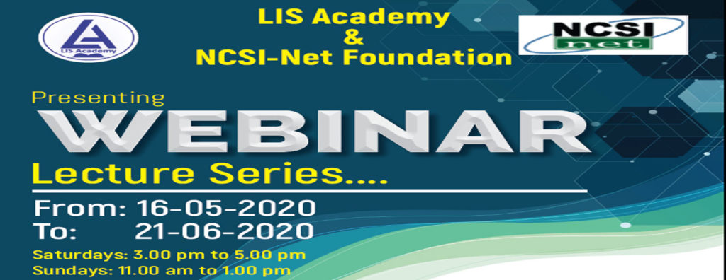 The LIS Academy in collaboration with NCSI-Net Foundation, Bangalore is happy to announce a series of webinar lectures for the benefit of LIS Professionals. The objective of this lecture series is to bring LIS expert speakers from industry, academia, and R&D sector to share their expertise and innovative initiatives implemented in their respective institutions. The Lecture themes include LIS market trends challenges and opportunities, skill set requirements of the Industry, Digital Content Creations, E-Resources management, Web Design, Research Data Management and Research Metrics, Information Retrieval Platforms, Communication Skills, and Personality Development.